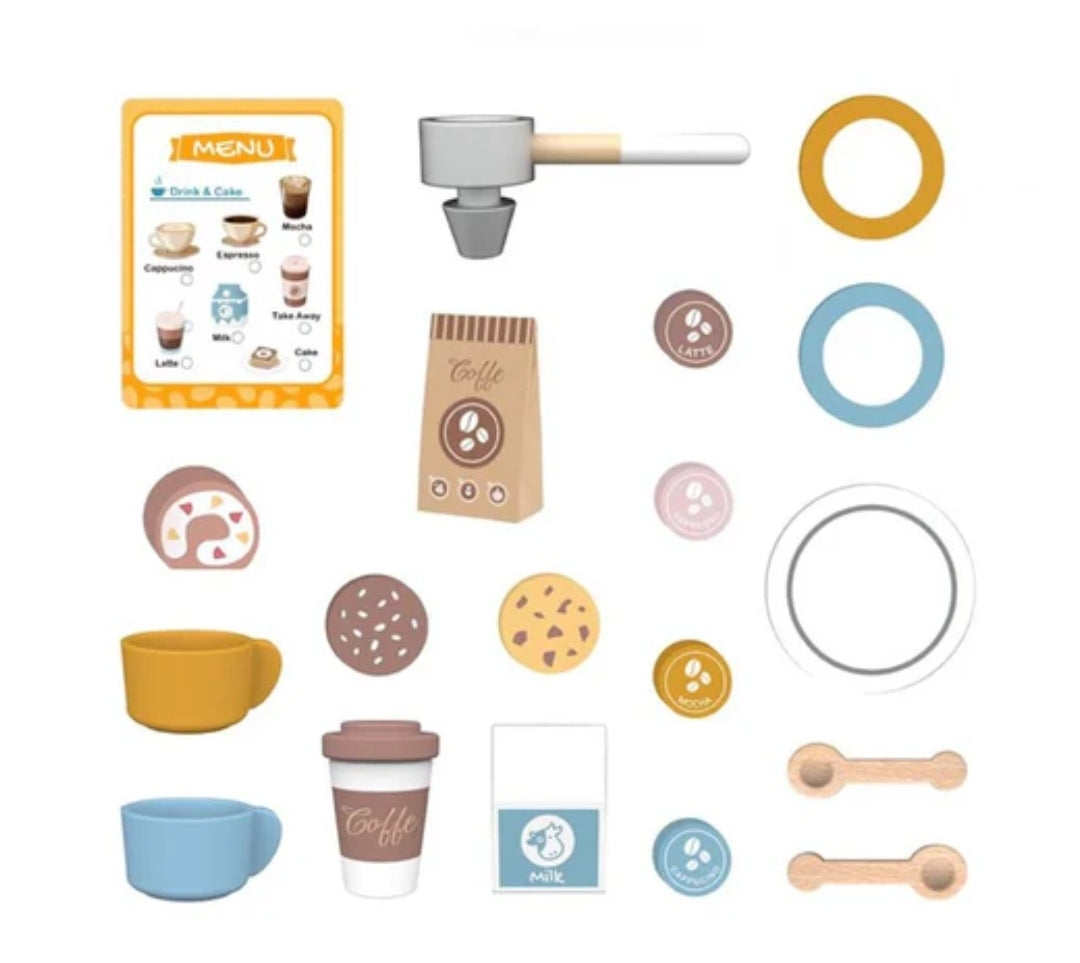 Accessories: Includes a machine, cups, spoons, milk carton, coffee bag, cookies, cake slice, and menu card.