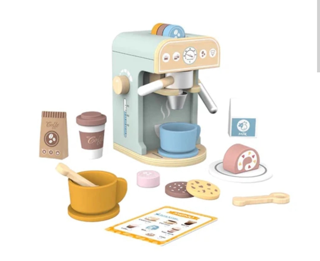 This is an adorable wooden pretend play coffee machine and cafe set, perfect for budding little baristas. The main piece is a stylish espresso machine rendered in a pleasing mint green and pastel color palette with natural wood accents. It features realistic details like movable knobs, a portafilter handle, and a steam wand, encouraging interactive play.